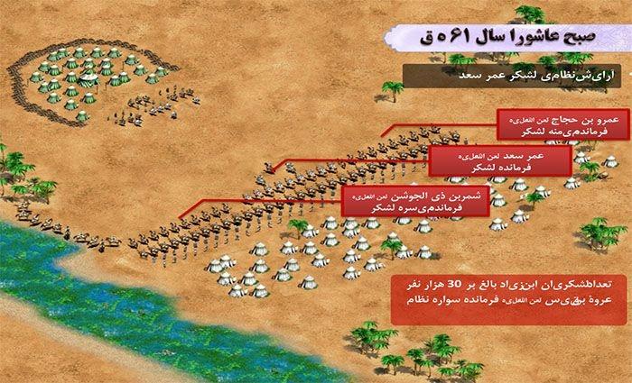 ▪ سعد نیز لشکر خود را توسط چند نفر هدایت میکرد. عمروبن حجاج و شمر، جناحهای راست وچپ لشکر را فرماندهی میکردند. عمروبن قیس و شبث بن ربعی هم سواره نظام و پیاده نظام لشکر عمر سعد را رهبری میکردند.